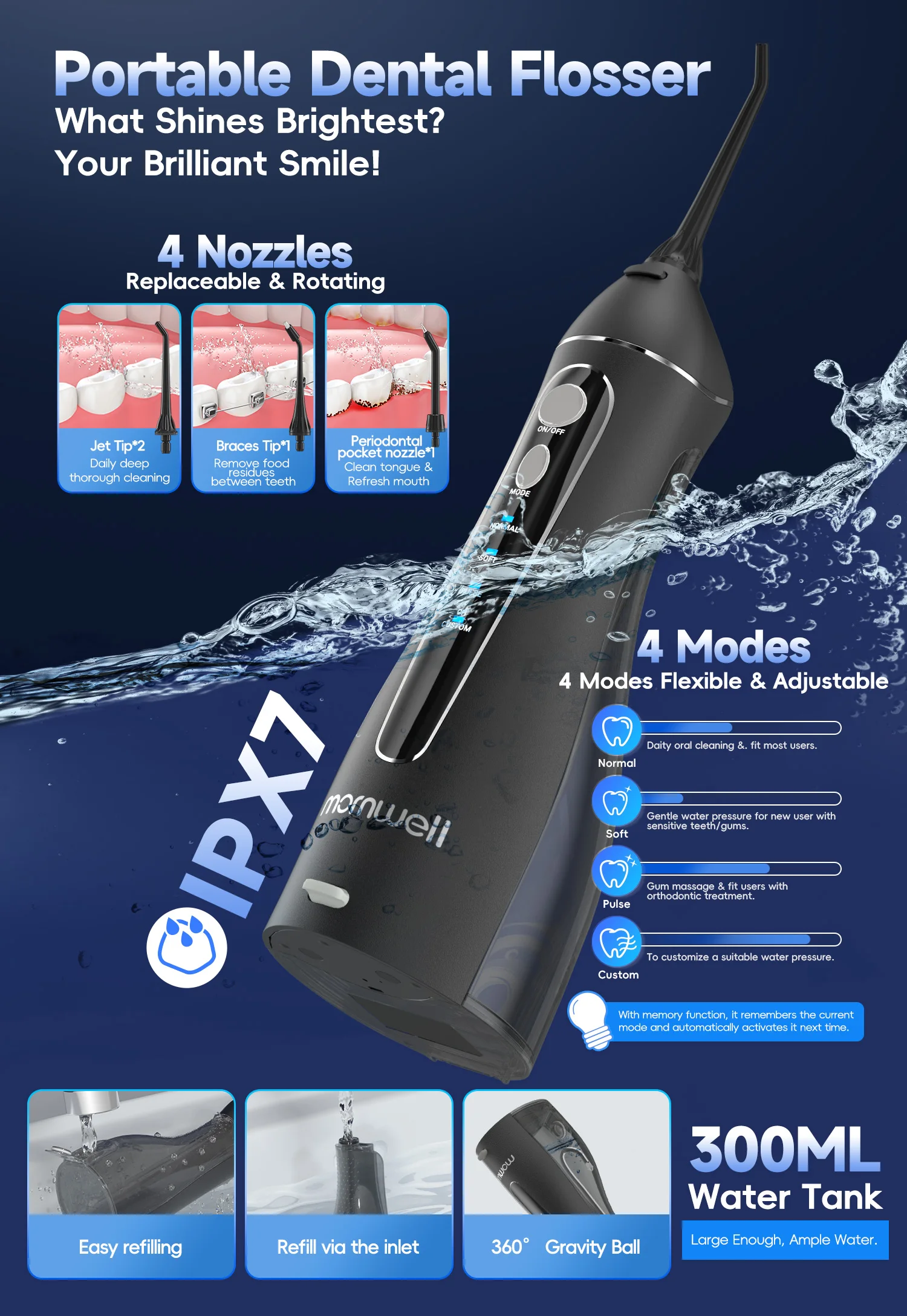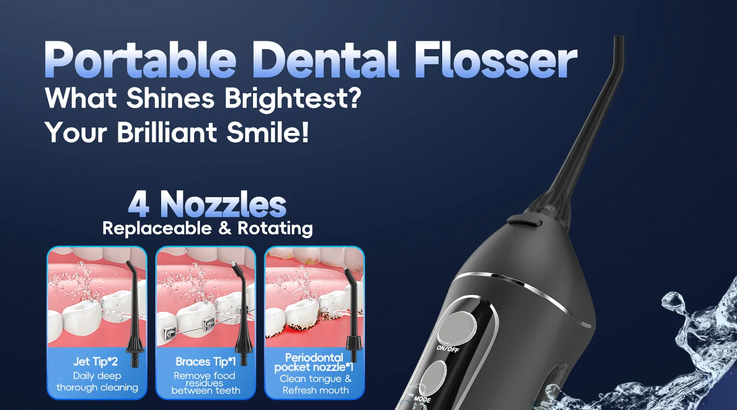 【 Super Long Battery Life &T IPX7 Waterproof】Water dental piks With powerful and environmental battery, fully charged need 4 hours and used continuously for about 30 days. With dual-sealing protection, Our water flosser cordless is leakproof and IPX7 waterproof,ensuring safe use for bathroom or shower. Come with USB cable,compatible with various charging devices. Perfect for travel and home use!