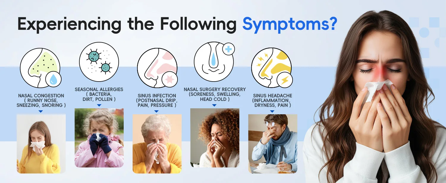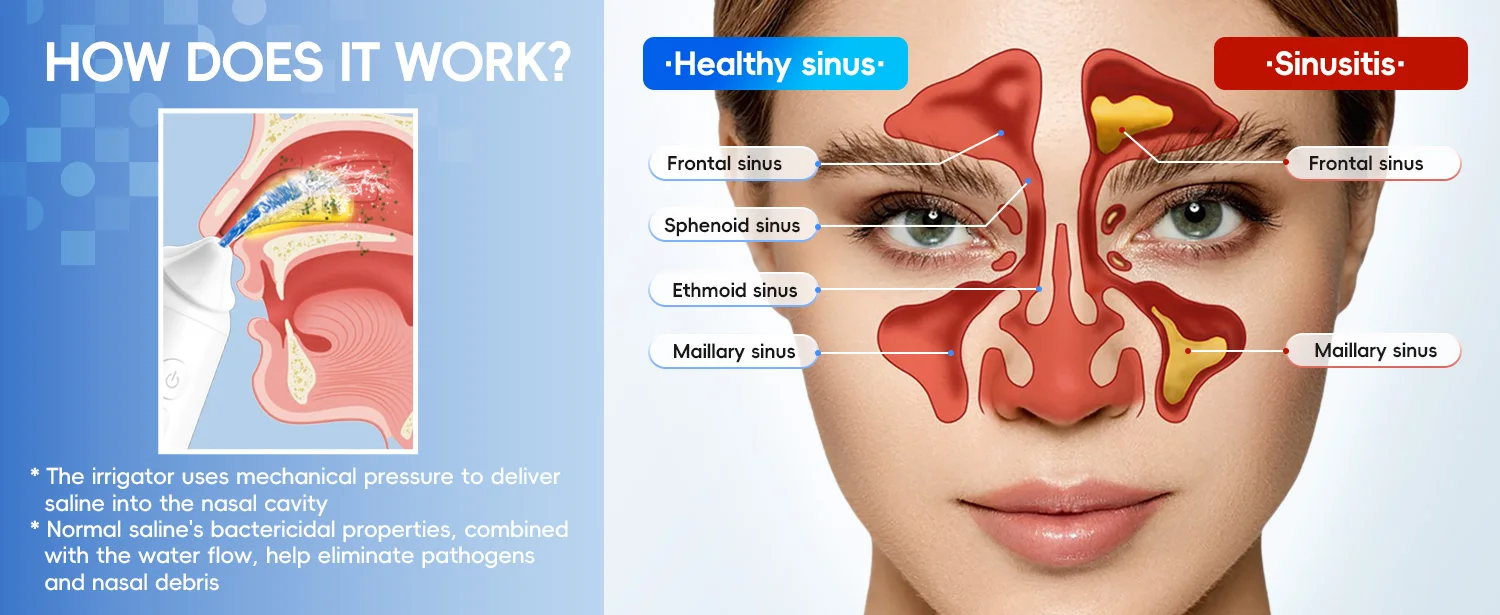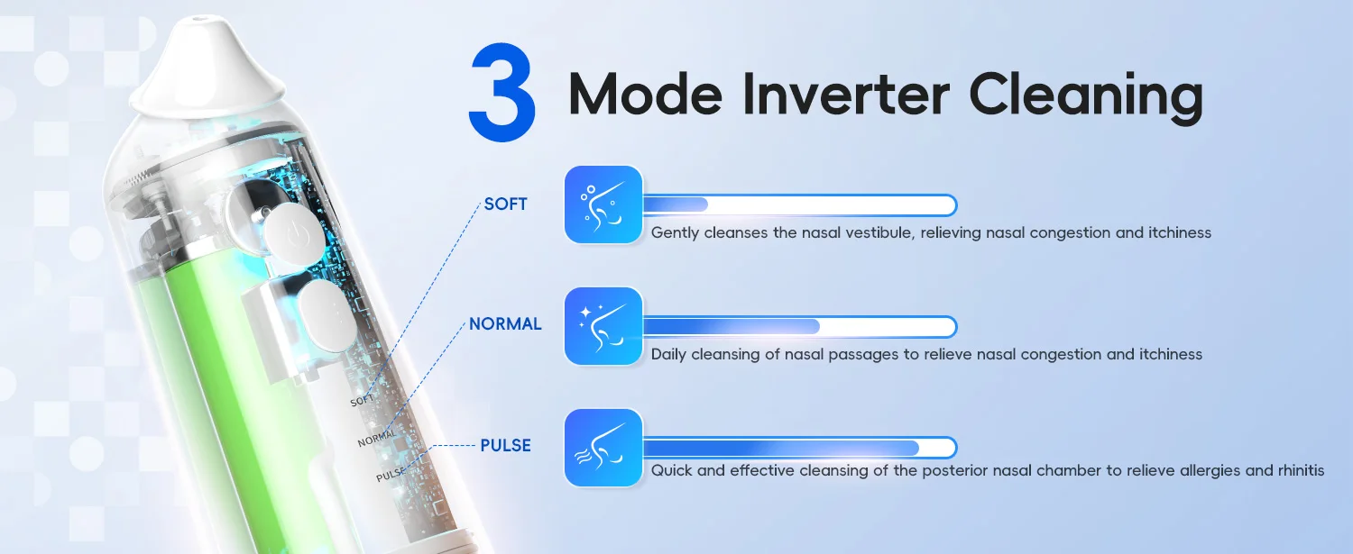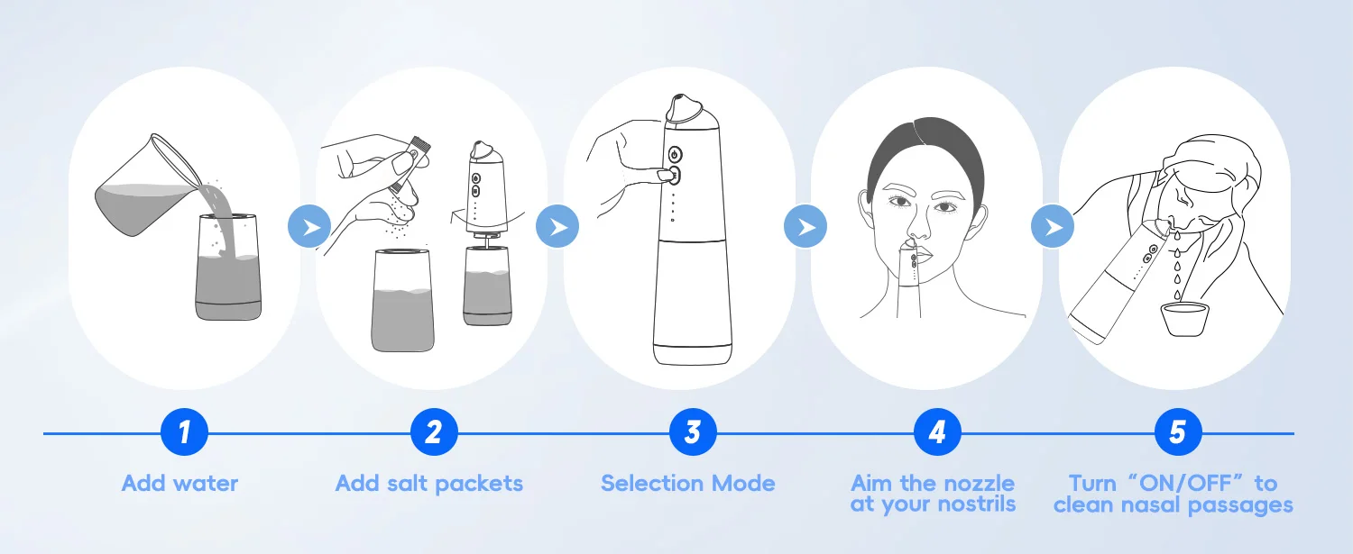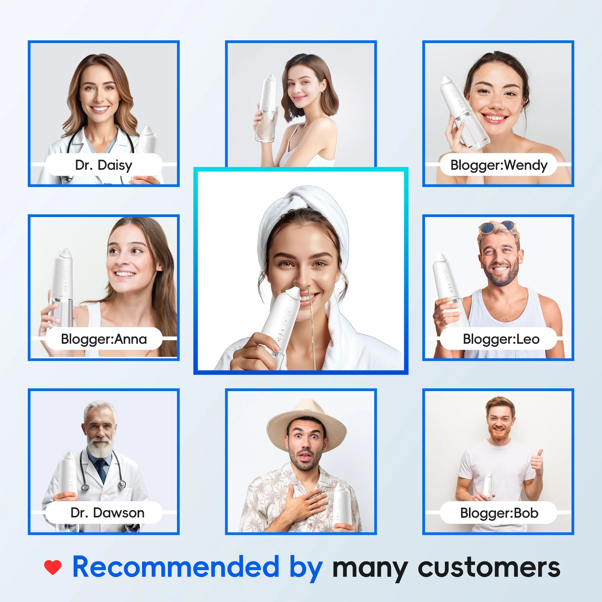 30-SECOND NASAL RINSE: Quickly clear nasal congestion in just 30 seconds with our automated nasal cleaner. Unlike traditional sprays, neti pots, or squeeze bottles, it delivers a larger saline volume with adjustable pressure for a deeper, customized clean. Effectively rinse out allergens, mucus, and germs with one-touch operation, providing fast relief and better sleep—without the need for medication
